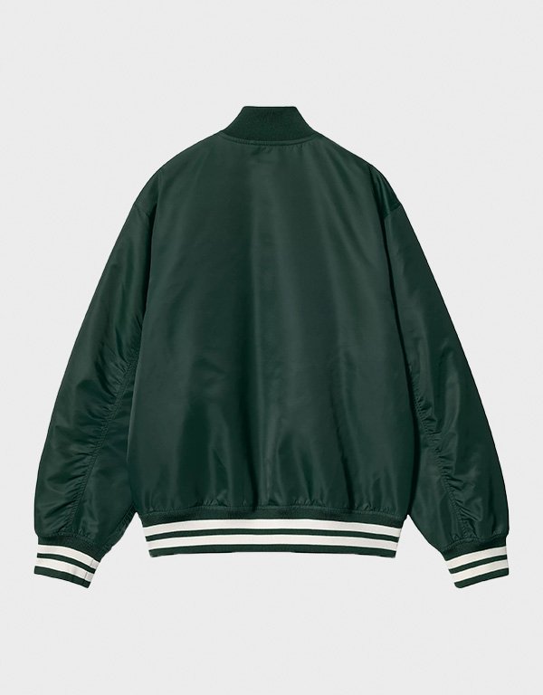 The Carhartt Flaming Ducks Bomber Jacket is an elegant and sturdy clothing item that will help those that care not only about style but also utility. This jacket presents a lightweight, but durable effect made of quality nylon. The vibrant color green gives it a fresh and lively effect as it would shine in any casual and streetwear dressing. The jacket with the vintage-like varsity collar looks has an air of retro charm with an eye-catching blend of modern style. It has thick button closures at the front. The jacket is practical and has long sleeves that provide good cover and protection against the elements. Ribbed cuffs have been introduced as well in order to provide a snug fit around the wrists thus retaining warmth and keeping the cold away. This jacket would be a smart purchase, especially by anybody that wanted to expand their wardrobe with a vintage-style jacket, but with a little something special.
