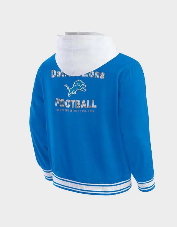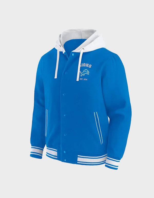 The Detroit Lions Blue Hooded Jacket signifies the epitome of style and comfort through an efficient welding of sporty design with utility for everyday wear. It is made of plush, sturdy cotton that feels light and slightly warm. The viscose lining enhances comfort and air circulation, along with the smooth liner. The hooded collar also doubles up as additional protection. The jacket is very simple in its concept, having delicate front snap tab buttons that allow you to put on or take off the jacket effortlessly. The sleeves for women are long, rib knit, and fit closely. Two parallel waist pockets are sufficient not only for keeping your hands warm but also for lowering smaller essentials into them safely. There are also two inside pockets to have valuables or mobile devices close at hand. This bright blue is a must have for every fan.
