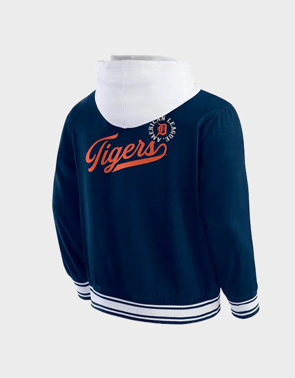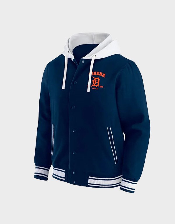 This officially inspired Detroit Tigers hooded jacket is comfy and stylish as you wear it to show your Detroit Tigers pride. The jacket is of superior cotton, which makes it durable and breathable in the various seasons. The inside is also covered by a soft viscose, making it cosy and extra warm during the season of cold weather. It has a sporty feel with a smart looking hooded collar, giving good protection without losing the shape. Its front has a snap tab button closing that gives the touch of vintage. Rib knitted cuffs on long sleeves give insulation and give a tight fit to remove cold air. There are also two parallel waist pockets where you can place your hands to get warm, and there are also inner pockets which store any important things. The rich navy blue colour is a signature colour of the Detroit Tigers.