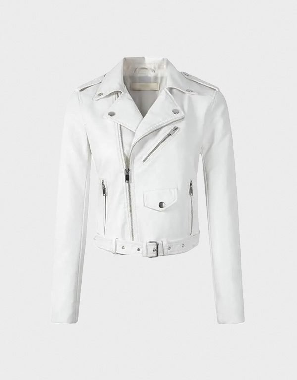 Women Asymmetrical White Zipper Biker Leather Jacket